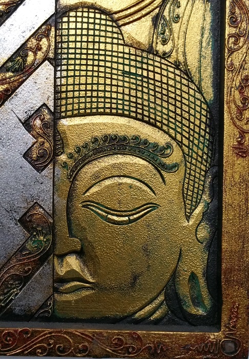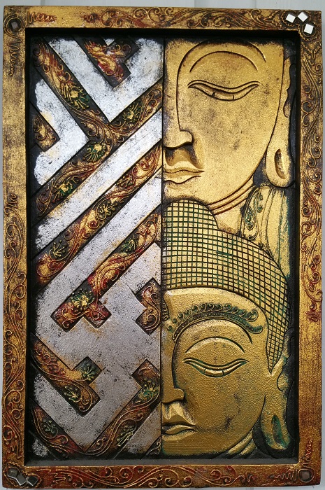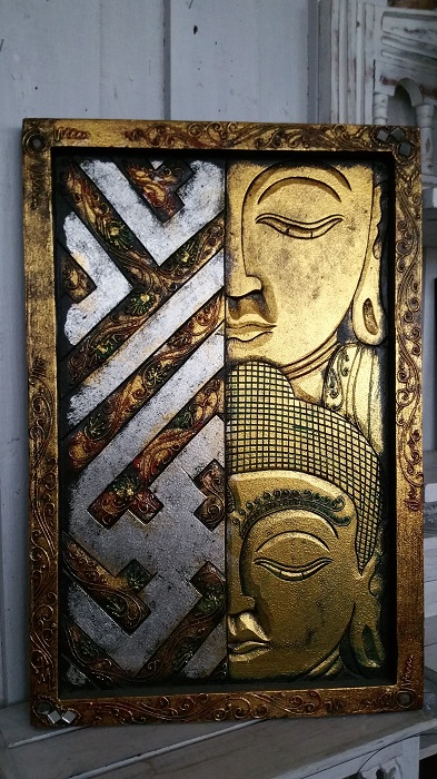 Stor Buddhatavla. Vackert utsnidad i trä med vackra detaljer. Höjd 60 Bredd 40 cm ca. Tavlans djup (tjocklek) är ca 2,5 cm.