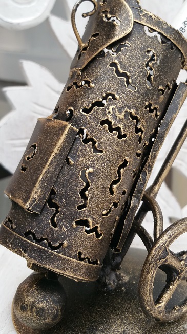 Höjd ca 15 cm. Diameter på underredet ca 9 cm. Innermåttet på bagen, längd ca 11 cm, diameter i hålet 4 till 4, 5 cm.