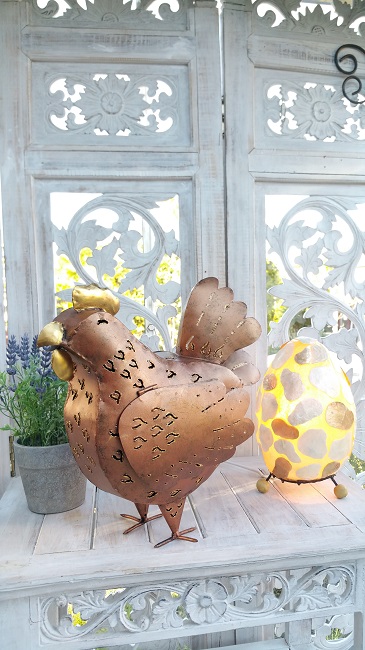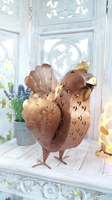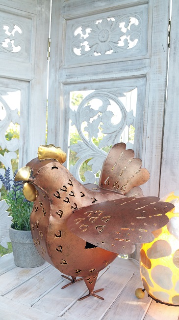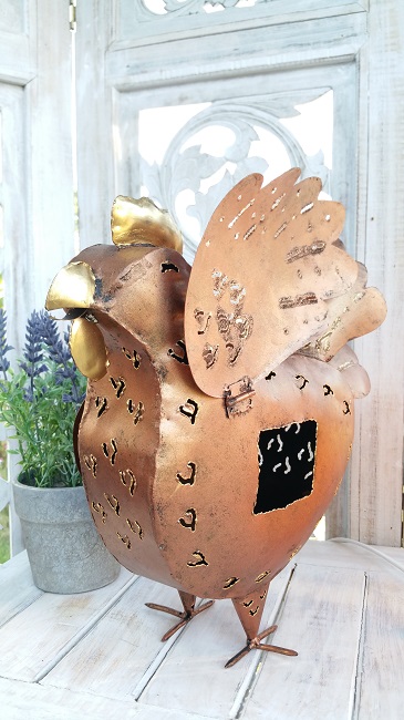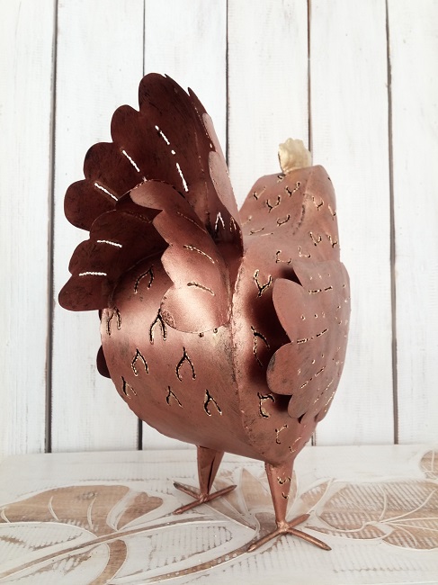 Stor Höna i plåt, smide. Målad med färg i kopparton. Stor plats för värmeljus.