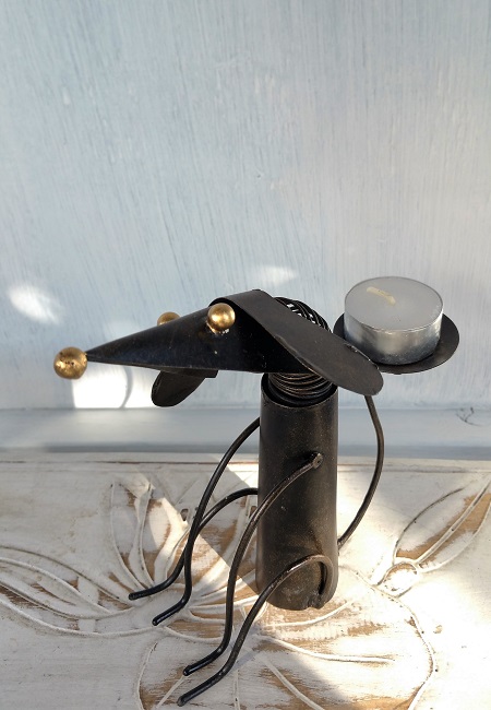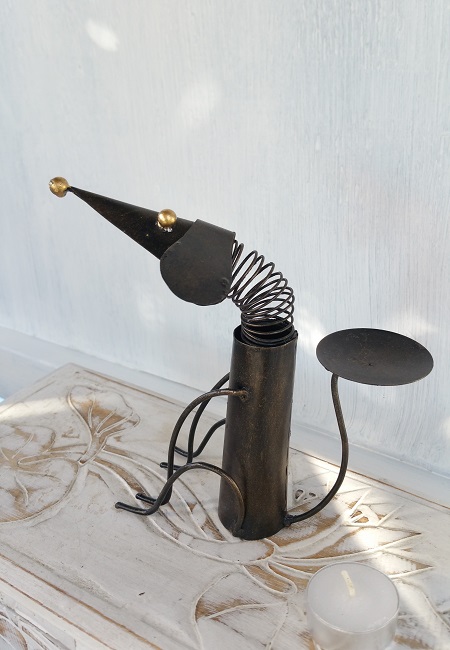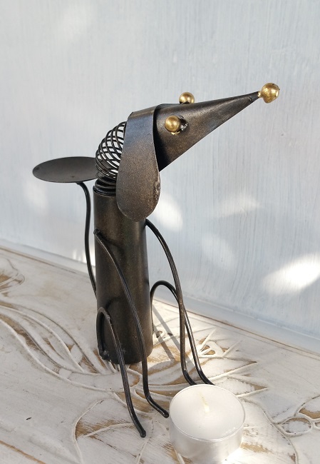 Lykta, ljushållare. Hantverk i form av en hund. Gjord för att kunna sätta ett värmeljus upptill på svansen. Hundens hals är gjord av en fjäder.