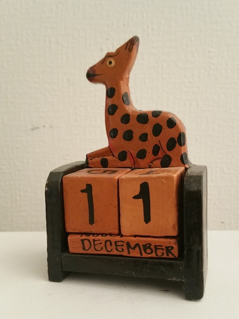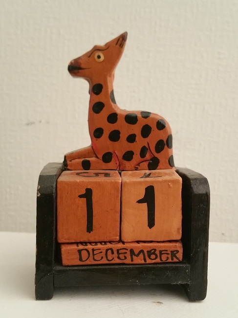 Kalender med motiv av en Giraff. Handgjord i trä och målad för hand. Många delar. All text skriven på svenska.