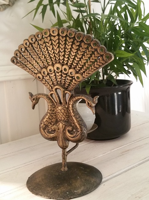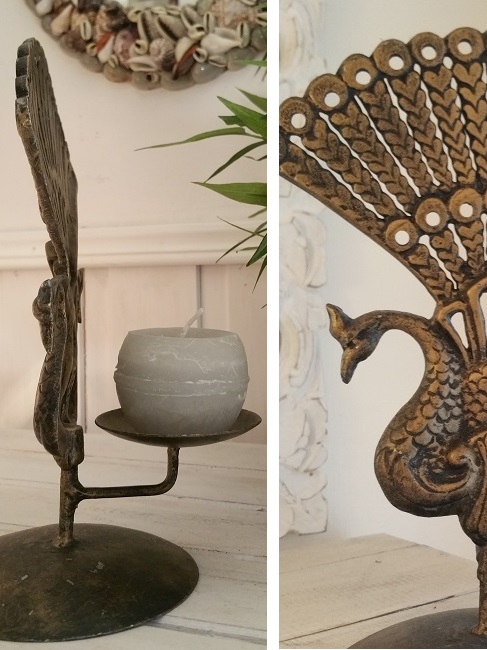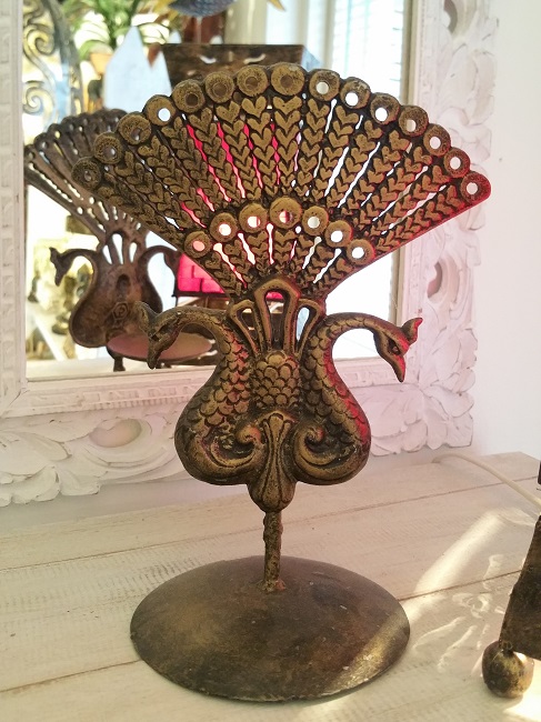 Lykta med motiv av legendariska påfåglar. Den här lyktan/ ljushållaren är gjuten i lättmetall och dekorativt målad i guld och svart. Värmeljus eller mindre blockljus kan användas.