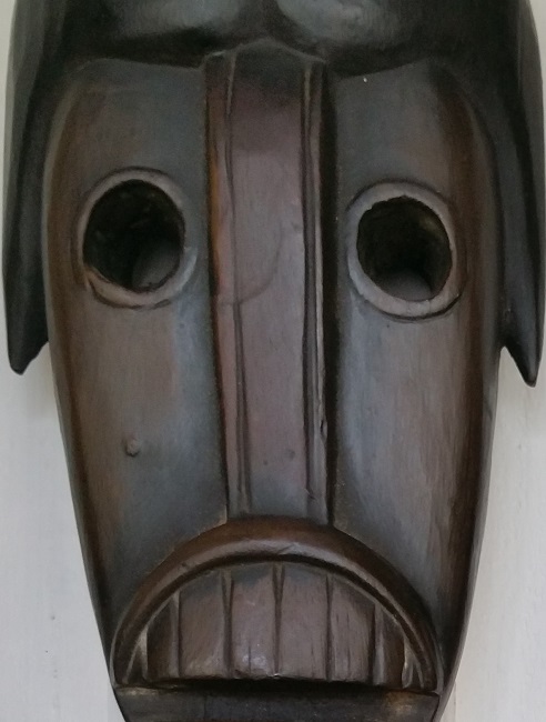 Mask i Afrikansk stil. Antikt utförande i färgsättning. Total höjd och bredd ca 50 x 30 cm.
