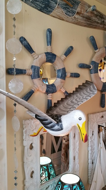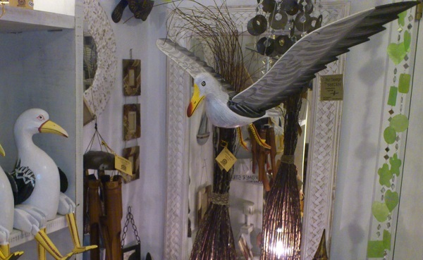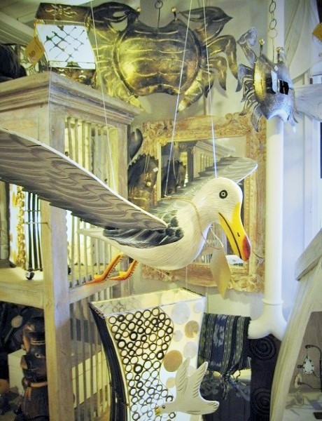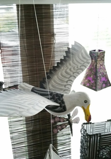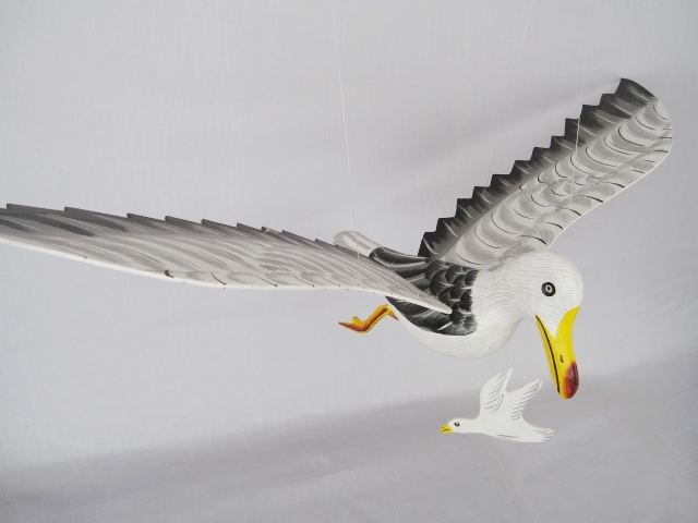 Mås Träsnide. med liten silhuettemås hängande under.