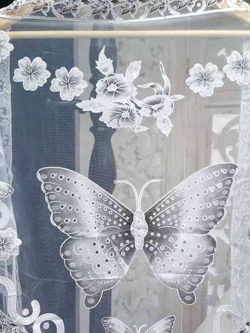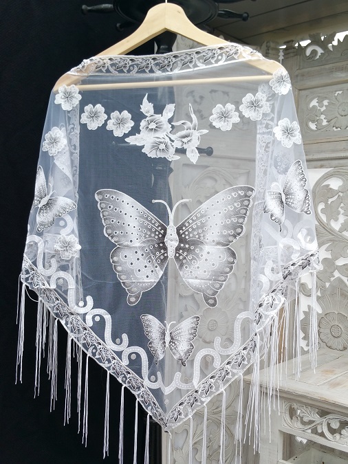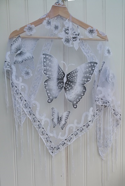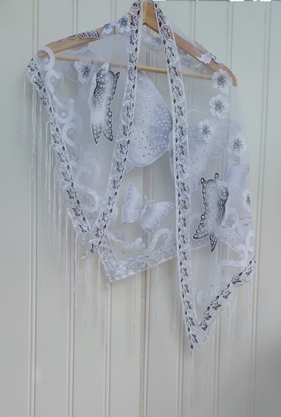 Sjal med motiv av Fjäril. Material i syntetmaterial. Ska ej tvättas i maskin. Längd 150 cm. Modellen är i trekant, med längsta bredd på ca 65 cm.