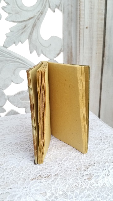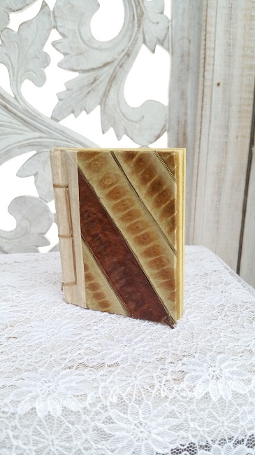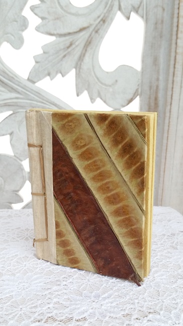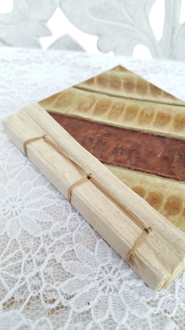 Liten bok för anteckningar. Dekorativa naturmaterial från olika träd och växter har använts. Speciell bindningsteknik i bokryggen.