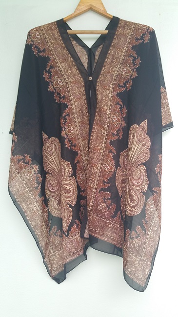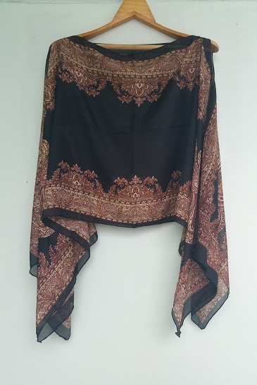 Denna tunnare tunika i chiffong kan bäras på flera sätt. Se bilder på 2 sätt att bära den, över en topp eller bikini. Passar lika bra till festliga tillfällen som på beachen en solig dag. Den kan dessutom göras till en snygg scarfes (se bild på modellen i Vit/Brun) eller knytas upp så det mer liknar en blus.