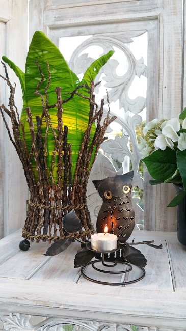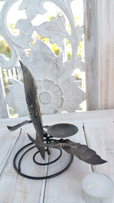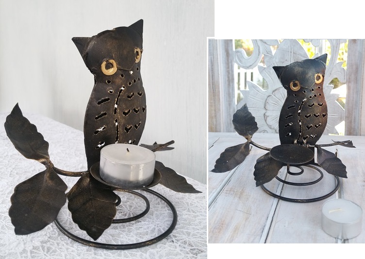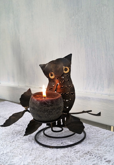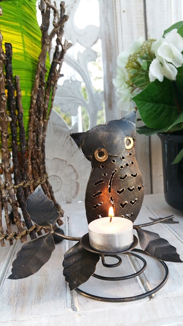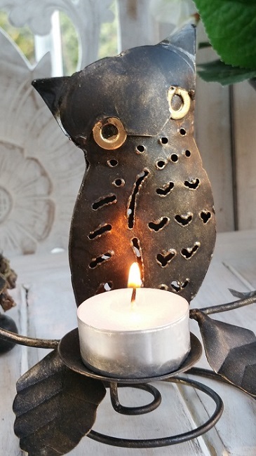 Uggla i metall. Hantverk i smide. Mycket detaljer med bladdekorationer vilka kan variera något från varje handgjort exemplar. I ljushållaren placeras ett ljus framtill som lyser upp Ugglan vackert. Det går att använda olika typ av ljus.